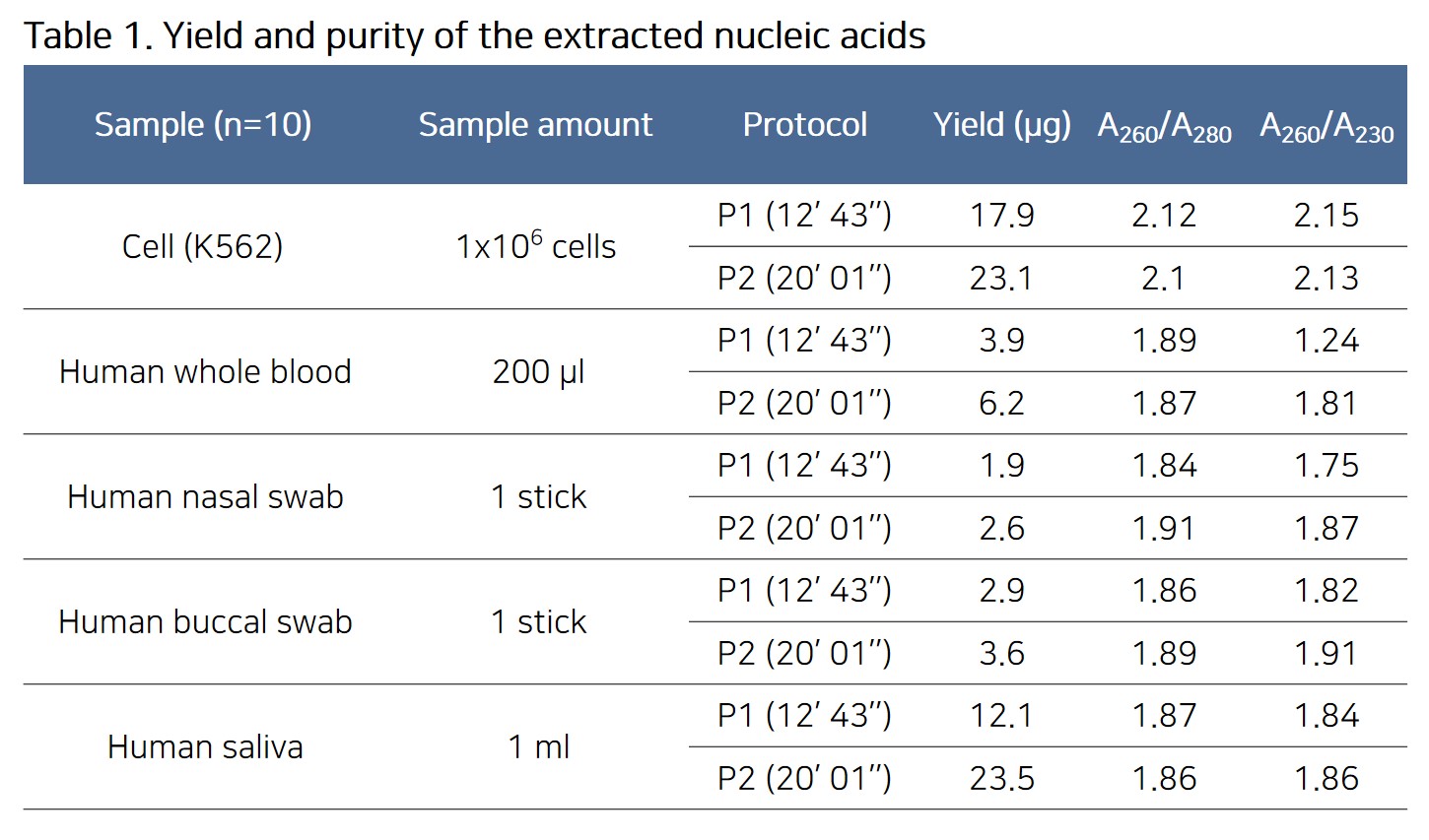 | Preparation time | P1 Protocol: 12' 43'' P2 Protocol: 20' 01'' |