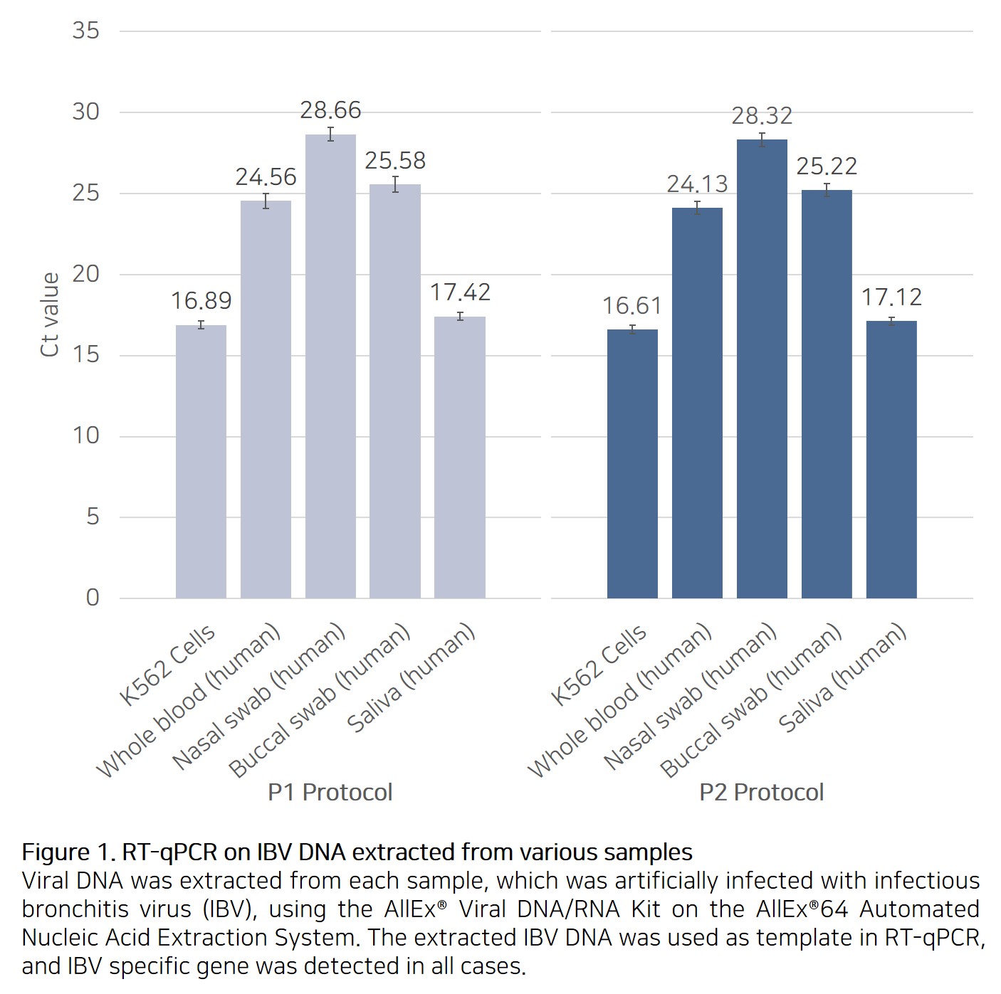 AllEx® Viral DNA/RNA Kit는 AllEx®64 자동화 핵산 추출 시스템의 전용 viral DNA/RNA 추출 키트이며 혈액, 세포, 체액 및 다양한 임상 샘플에서 쉽고 빠르게 viral DNA/RNA를 추출할 수 있도록 설계 및 개발되었습니다. 추출된 고품질의 viral DNA/RNA는 PCR, qPCR, RT-PCR, qRT-PCR 등을 포함한 다양한 downstream application에 적합합니다. AllEx® Viral DNA/RNA Kit의 사용자 친화적인 설계 및 디자인, 편리한 자동화 기능을 통해 고품질의 viral DNA/RNA를 안정적으로 추출할 수 있으며, 추출된 고품질의 viral DNA/RNA는 분자생물학 응용 분야에서 신뢰성 있는 정확한 결과를 제공합니다.