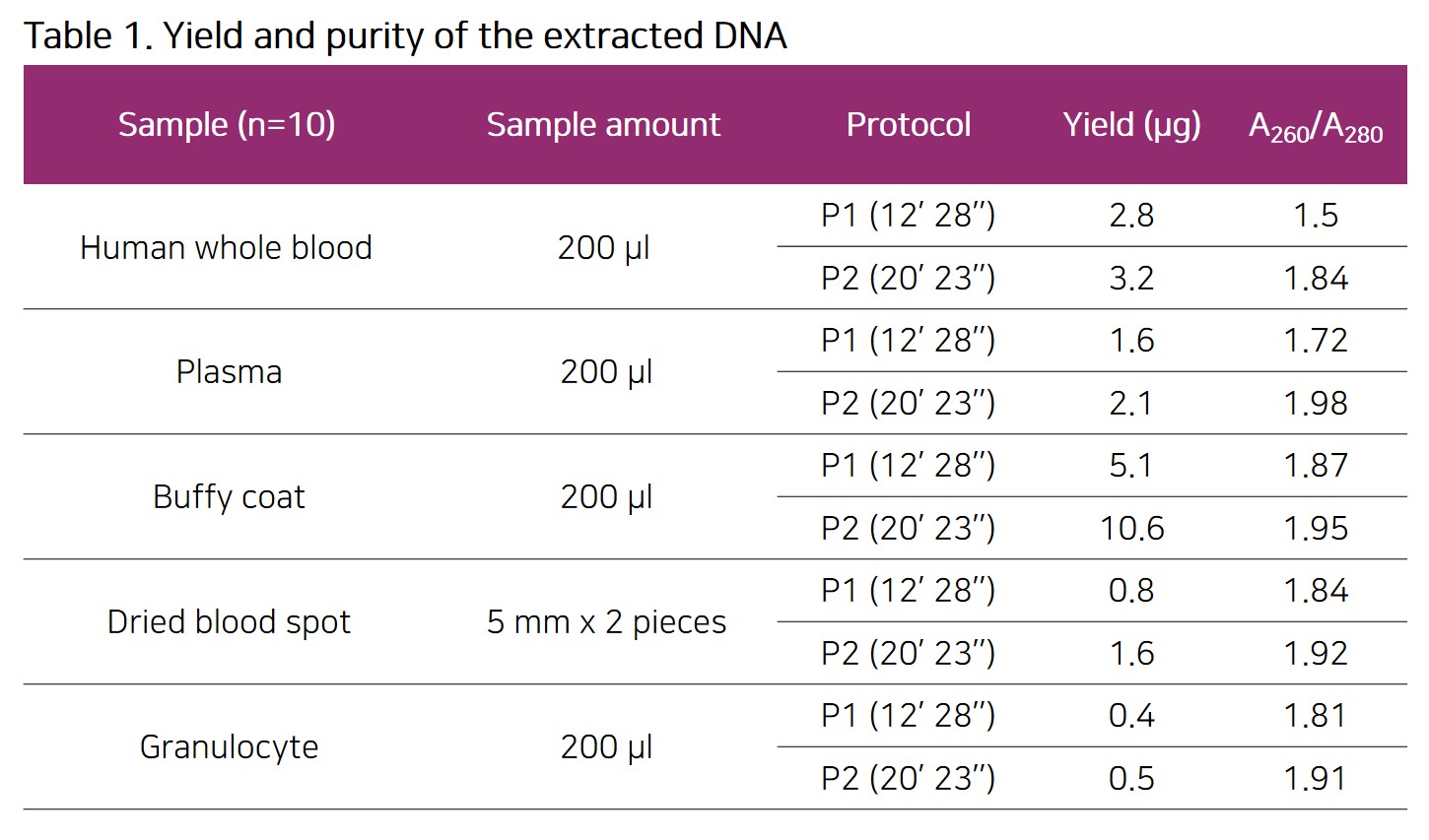 추출된 고품질의 blood DNA는 분자생물학 응용 분야에서 신뢰성 있는 정확한 결과를 제공합니다.