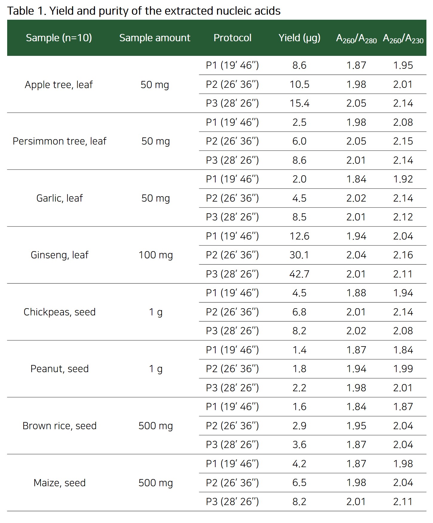 식물의 seed, bark, leaf 등 다양한 식물 샘플에서 쉽고 빠르게 plant DNA/RNA를 추출할 수 있도록 설계 및 개발되었습니다.