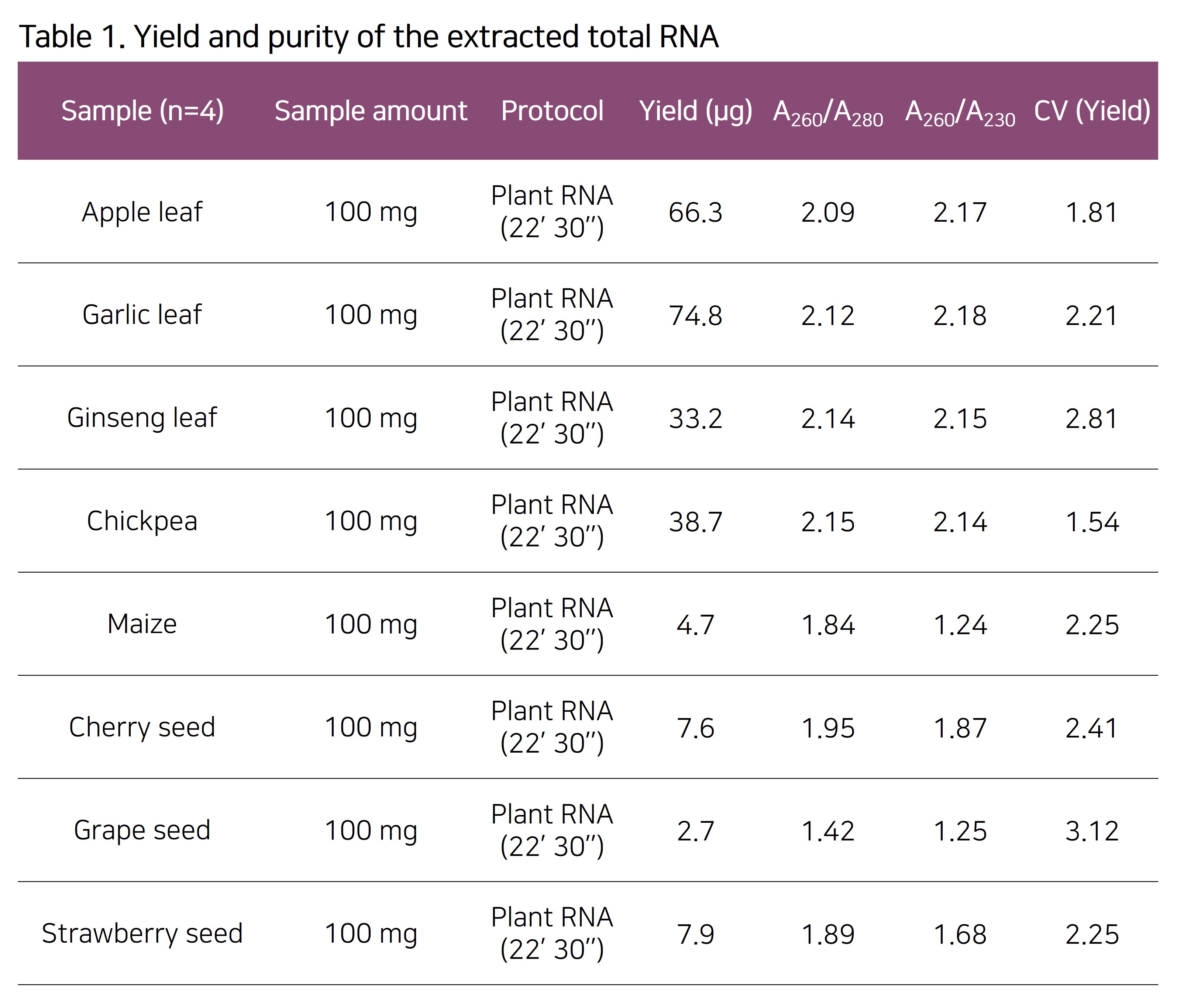 식물의 seed, root, bulb, bark, leaf 등 다양한 식물 샘플에서 쉽고 빠르게 total RNA를 추출할 수 있도록 설계 및 개발되었습니다.